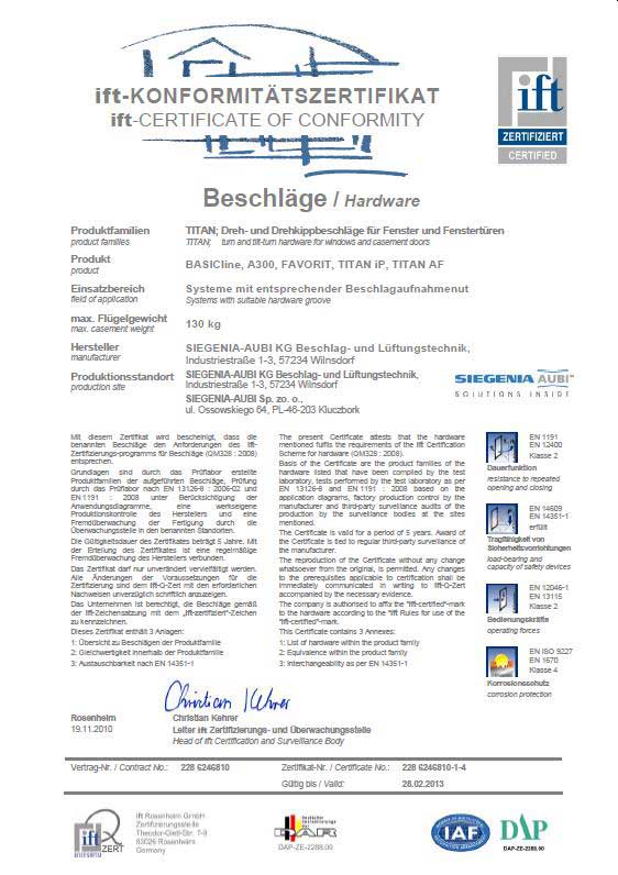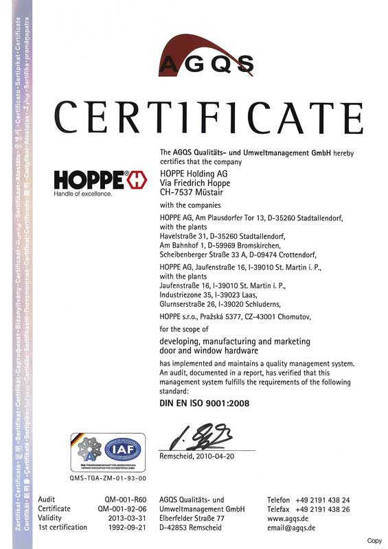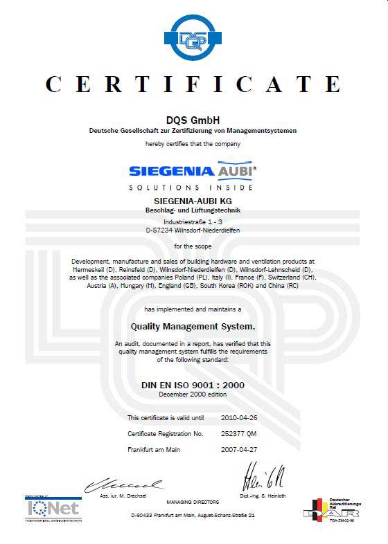 Τα ευρωπαϊκά εργοστάσια των οποίων τα προϊόντα αντιπροσωπεύει η εταιρία μας διαθέτουν όλες τις πιστοποιήσεις ISO και CE διασφαλίζοντας έτσι την ποιότητα των προϊόντων που προσφέρουμε στους πελάτες μας (Maico, Siegenia-Aubi, Sikkens, Polaris, Deventer).